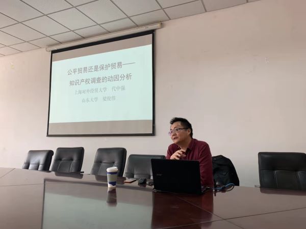 举办的“公平贸易还是贸易保护—知识产权调查的动因分析”讲座在德经楼308举办,来自上海对外经贸大学的代中强教授讲授了关于美国对世界对主要贸易伙伴国提起知识产权诉讼的动因分析。