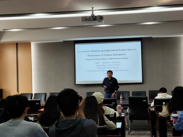 邀请,中山大学李兵教授在仙林校区德经楼308会议室作了题为E-commerce Platform and Agricultural Product Imports Performance of Chinese Enterprises: Em-pirical Evidence Based on Big Data from Alibaba的学术讲座,讲座由飞速直播