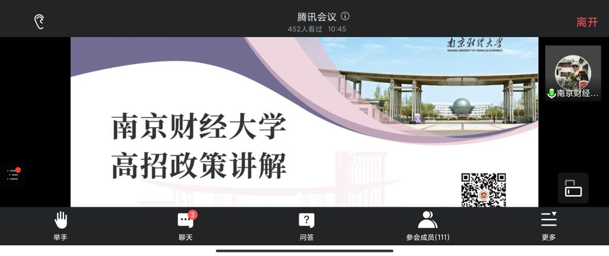 承接省外招生的第一年,通过校友的支持,参加“江苏好大学”天津联合招生宣传联盟,联盟的高校分别是南京大学、东南大学、南京师范大学、南京财经大学等13所高校,6月15日通过腾讯会议举行网络直播宣讲,吸引了大量的天津地区学生和家长参与。