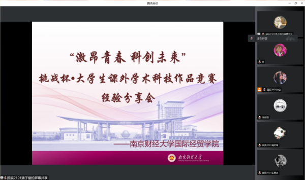 以线上方式顺利举办了“挑战杯”大学生课外学术科技作品竞赛经验分享会。本次活动邀请到了张晓磊老师、国实2001郑孔迪、贸经1902戴聿扬以及国贸1903王棣等同学进行了精彩的经验分享。