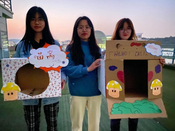 为垃圾们寻找合适安置地的同时,同学们还利用快递纸盒为校园内的喵小主们制作了温暖的猫窝。初冬已至,南财校园内的猫咪们也该添置新的过冬装备了,几位同学用别样的猫窝为初冬校园内的猫咪们送去了温暖。同学先用胶带将正方形的纸箱四面封住,防止有寒风吹进窝内,然后又在一面开出一个适合猫咪身材的洞口。再接着,从洞口将事先准备好的保暖物资铺满整个小窝。随着干草、棉花、布料的添置,猫咪的新家俨然一副柔软舒适的样子。最后,同学又在猫窝门口贴上了精心制作的门牌,喵小主的双十一新居就大功告成啦!同学把猫窝放在树丛后,不一会儿一只大橘就钻了进去。瞧这只大橘懒洋洋的样子,是不是你也被治愈了呢?