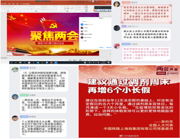 各个团支部分别针对两会中的“建议开设国家级心理健康平台”、“建议细化校园欺凌惩治标准”、“保护知识产权”、“制定个人信息保护法”等关系民生及社会发展的问题展开热议,发出青年声音。