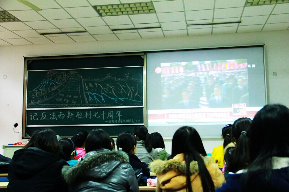 活动中,同学们通过集体观看电影《东方战场》,回顾了战争的历程,了解了反法西斯战争对全人类的重大创伤和其胜利的伟大意义。同学们纷纷发言,表达自己报效祖国,建设社会主义和谐社会的理想信念。虽然二战已经过去了整整70个春秋,但是在南京这样一个饱受战争摧残的城市,历史的印记仍旧历历在目。大家虽不曾亲身经历那段悲壮的历史,但血液里面迸发的爱国情怀却让大家无比珍惜当下的和平与安宁。一幅幅,一帧帧,热血和忠诚铸就了今日百折不挠的中华民族。