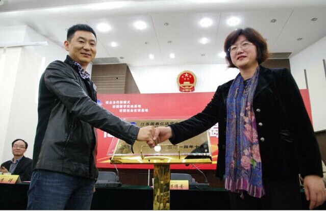 国泰亿达董事长才东升先生发言表示“早就有这样的想法,公司将致力于与大学的合作,让学生了解到社会和企业需要怎样的人才,促使高校培养出更多符合我国发展要求的实践性、创新性人才”。最后,邱伟芬副校长和国泰亿达董事长才东升先生一同为亿达工作室揭牌,并表示对双方合作愉快互进双赢的美好期望。国泰亿达公司人事主管李瑾女士为南财大亿达工作室颁发开办购置金,亿达工作室正式挂牌成立。