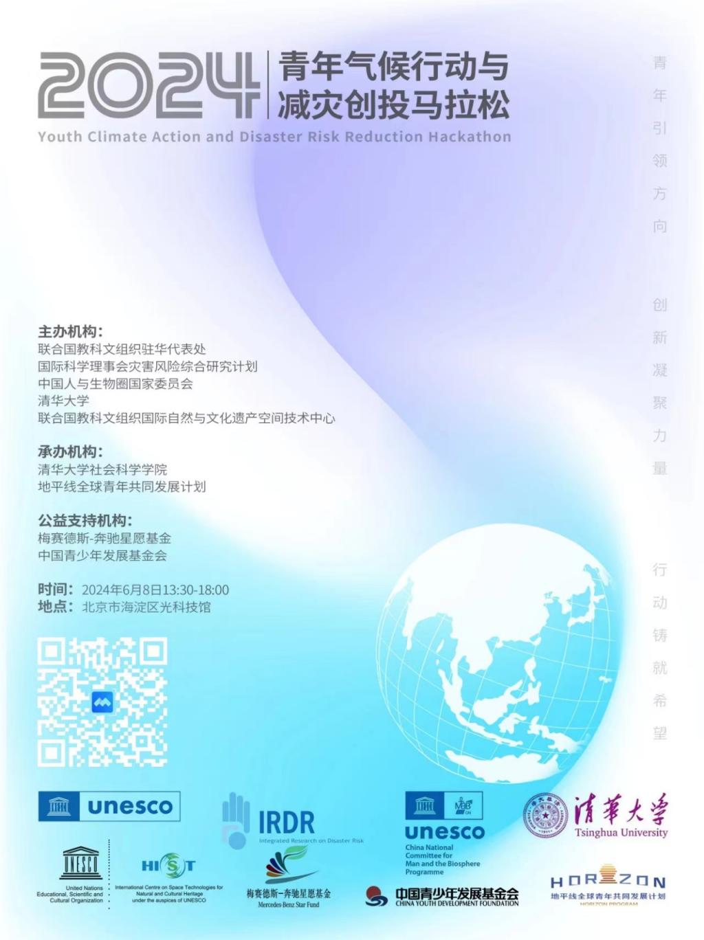 6月8日,由联合国教科文组织驻华代表处、国际科学理事会灾害风险综合研究计划、中国人与生物圈国家委员会、联合国教科文组织国际自然与文化遗产空间技术中心和清华大学共同发起的2024“青年气候行动与减灾创投马拉松”在北京光科技馆举行。