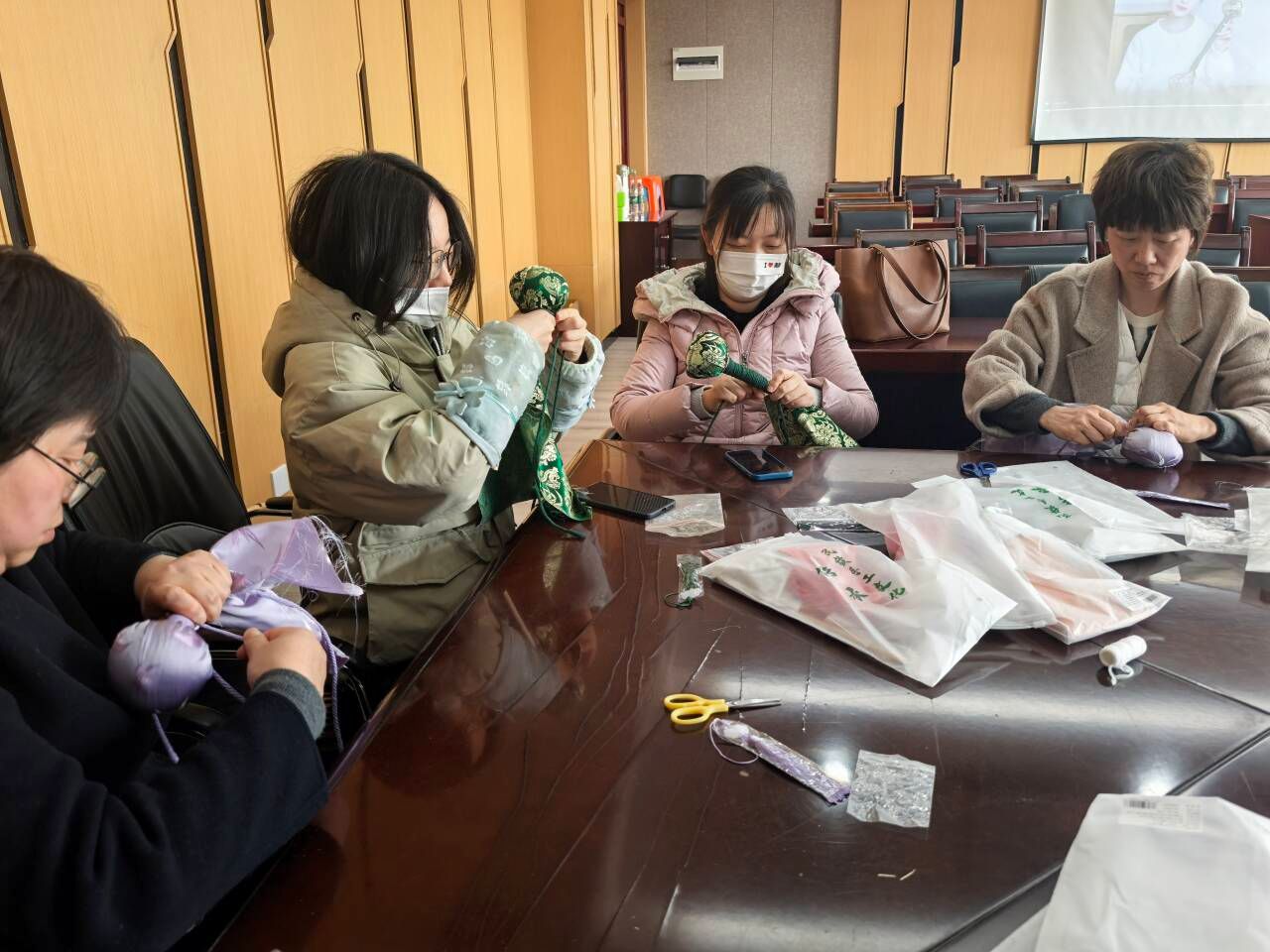 的女教工们济济一堂,开展艾草锤手工制作活动。