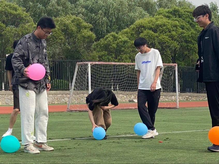 最后开展的第三个项目“协同作战”则更为考验各部门之间的默契配合,他们两两一组背夹气球、接力作战,开始令下,便争先恐后地冲向终点,周围不上场的部员们也忍不住为其部门加油呐喊,共同期待着比赛的胜利。