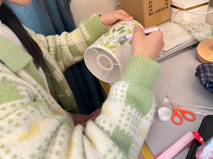 将台灯主干结构一一组装好,在灯罩上粘贴提前准备好的干花,并绘制各种图案,再用镊子对这些元素稍加调整,一个个精致而又美观的台灯才算是做好了。台灯作为一种很平常的生活物品,并不是那么引人注目,但这也是我国千千万万劳动人民的真实写照——正是他们用自己的光,在各个角落默默地奉献着,照亮着他人。贸经2201班陈晨同学说道:“每一盏熠熠生辉的彩灯背后都是辛苦的付出,所有的辛勤付出和劳动都值得被尊重,正因为这样一群默默耕耘的追光者,才有了万家灯火的温暖和美好。”