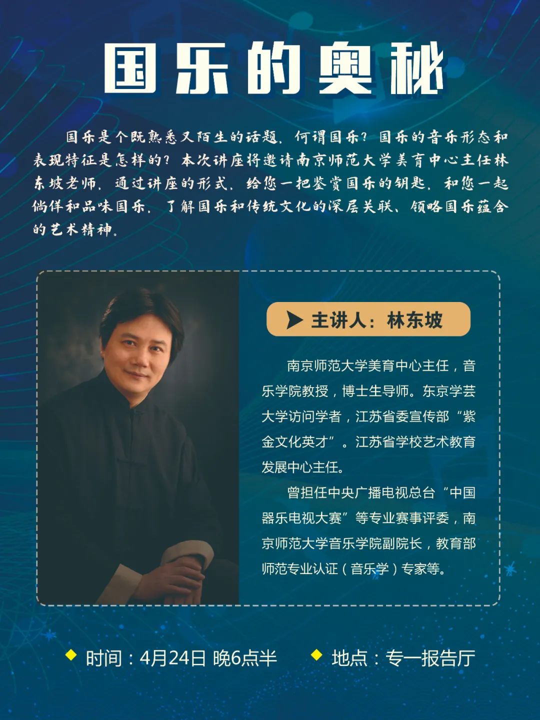 邀请,南京师范大学美育中心主任林东坡教授于4月24日晚在仙林校区德经楼报告厅为全校师生作了题为“国乐的奥秘”讲座。全校近200名师生聆听了讲座,讲座由飞速直播