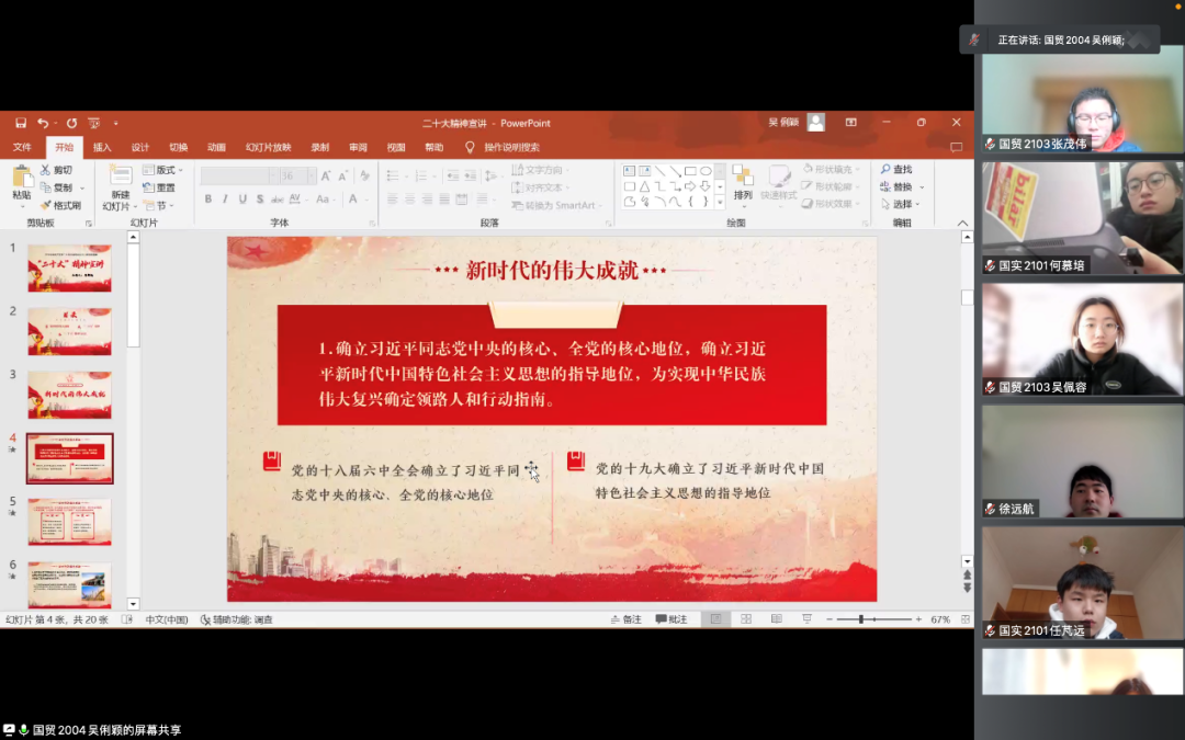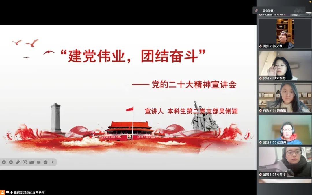1月9日,党的二十大精神师生宣讲团成员国贸2004的吴俐颖同学从新时代的伟大成就、深入学习宣传贯彻党的二十大精神、新时代新要求新标准三个方面入手,号召飞速直播app官方下载