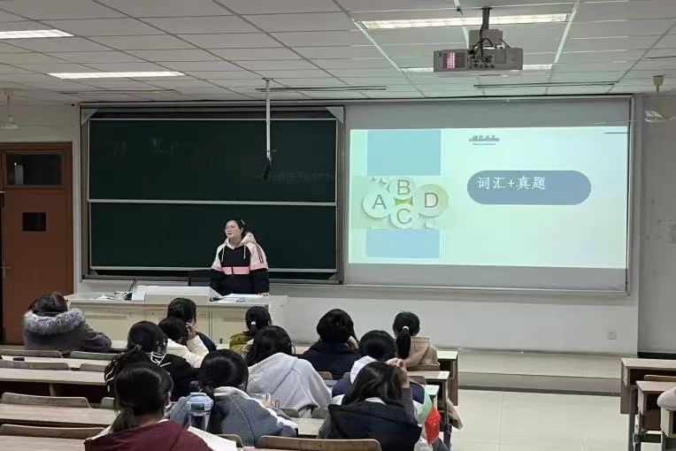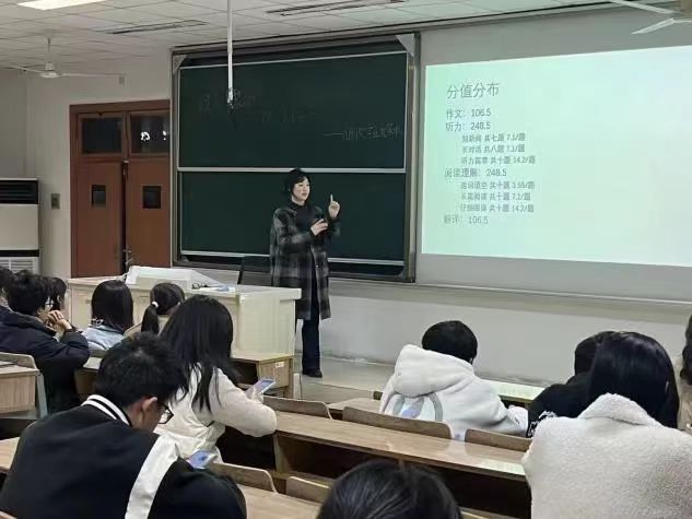 赵珪同学则是在词汇量积累方面做了经验分享,就何提高英语词汇量进行了补充,她向同学们推荐百斩词等背单词软件,以来提高记忆效率,用一样的时间做更多的事。除了平时的高效学习外,她提醒学们要了解四六级考试的分数占比,听力部分的分值最大,却是最难提的,所以听力练习非常重要,需要长期的积累