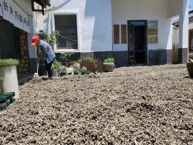 据陈老师介绍,艾草加工作为一项非遗文化,具有多种加工方式。艾灸,香囊,青团等都通过了二次加工,从而赋予了艾叶新的价值。在交流过程中,陈老师着重向大家介绍了艾草香囊的制作方法,陈老师表示,在前期准备过程中们,需要将艾草集中采摘晒干,只取艾叶部分并混合其他香料研磨。说罢,她带领团队成员们参观了正在晾晒的艾草干。看到满地正在晾晒的艾草,团队成员丁宇洋开玩笑地表示:“全是艾草,感觉自己已经被腌入味了,出去应该很驱蚊。”