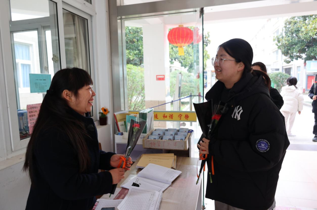 女老师、食堂和宿管站阿姨送上鲜花,感谢她们的辛勤付出。