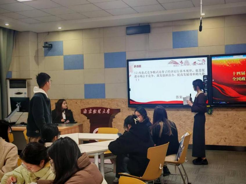 设计“两会知多少”趣味知识竞赛。题目涵盖“内卷式竞争”“提振内需路径”等热点。通过单选、多选及判断题型的综合比拼,同学们在抢答中深化对政策的理解。
