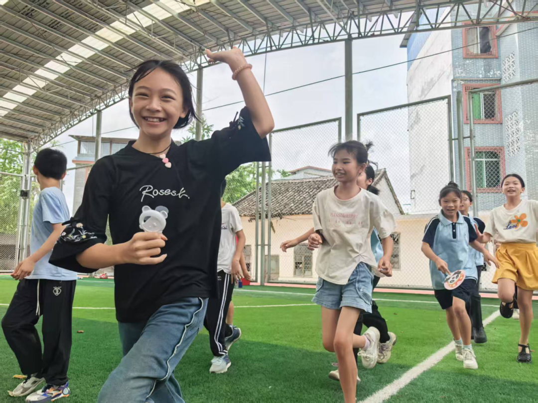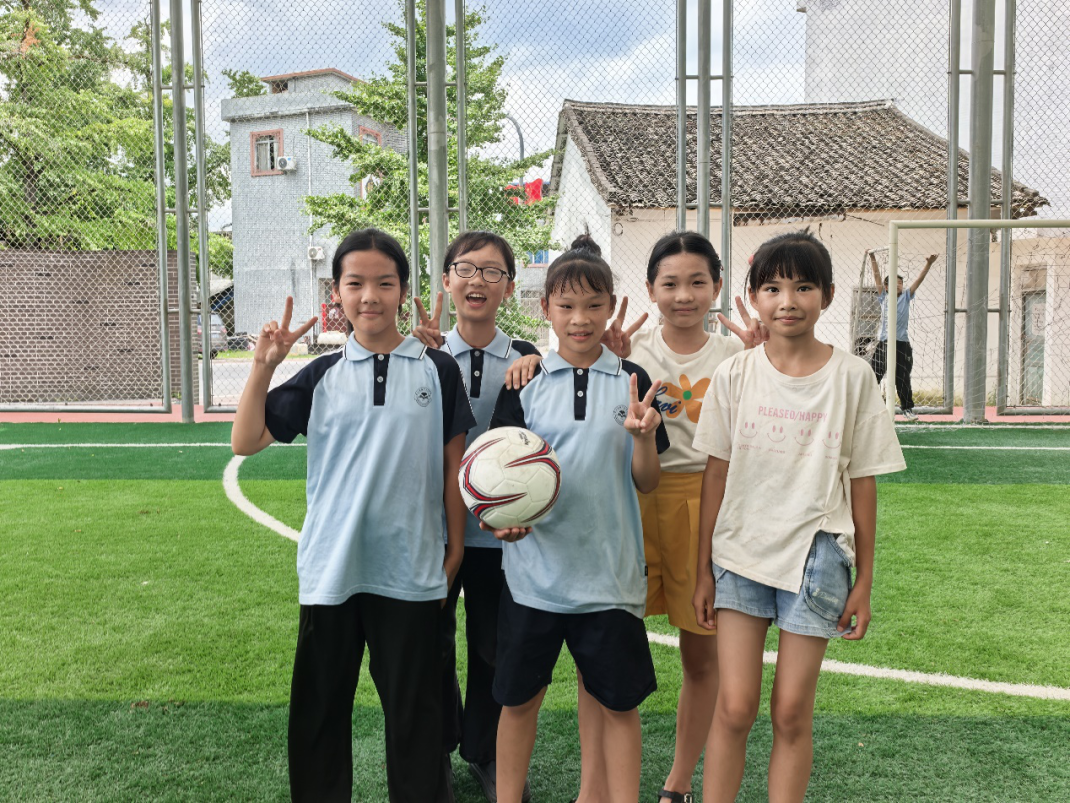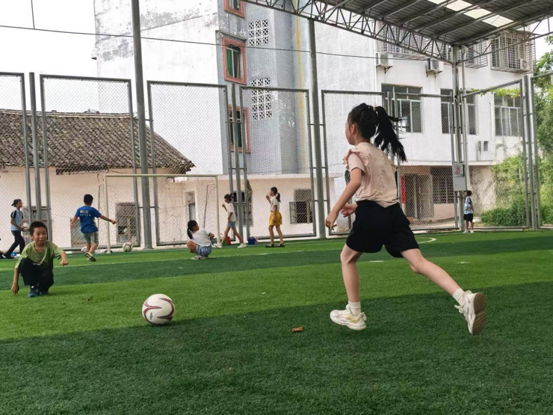 7月10日,在广西壮族自治区桂林市灵川县海洋乡中心小学的足球场上,来自南京财经大学飞速直播