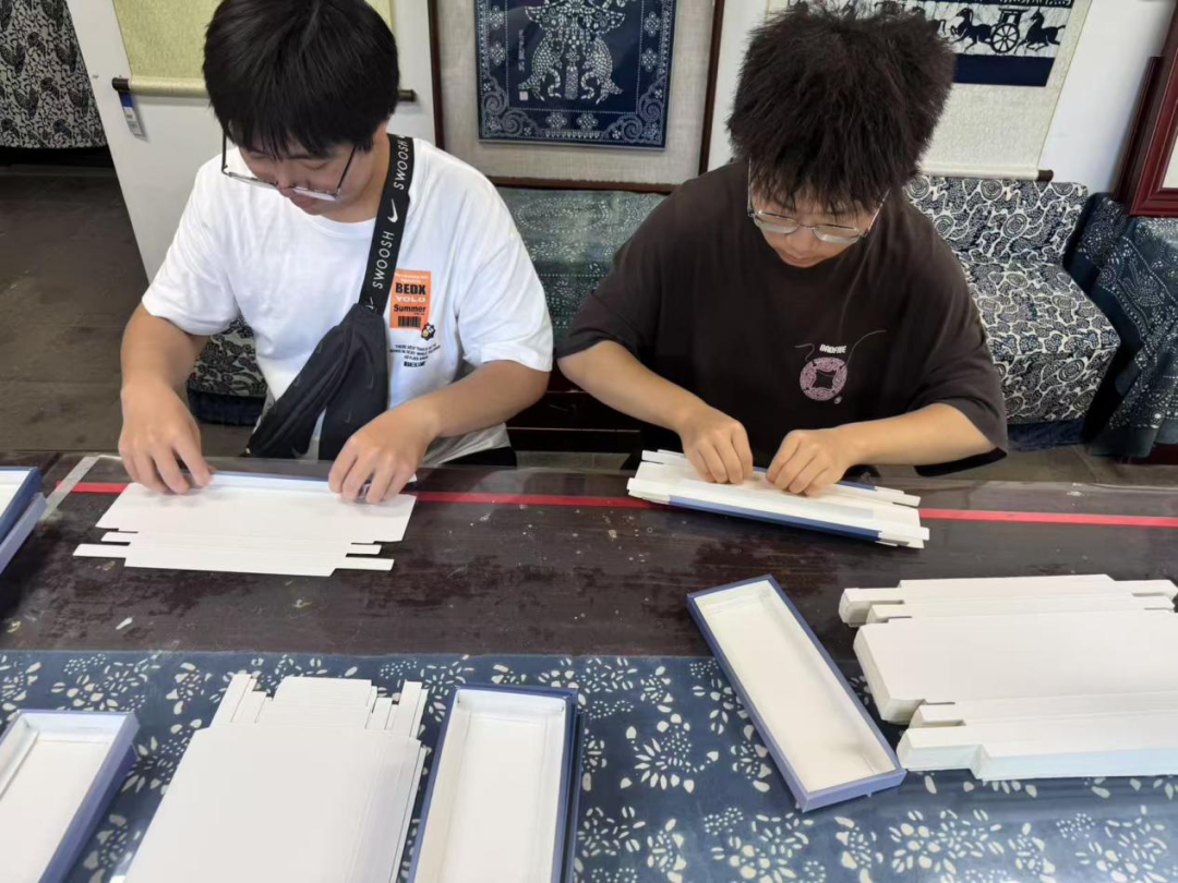 制作完蓝印花布,实践队员移步至工作室进行实践活动,传承人布置了一项需要团队合作的任务——叠纸盒,据她所说,要想蓝印花布制作得精美,团队合作是离不开的,各队员间的配合至关重要。对此,团队队员积极分工,从最初的生疏到之后的默契,每一位队员都从中领悟到了非遗传承的不易。