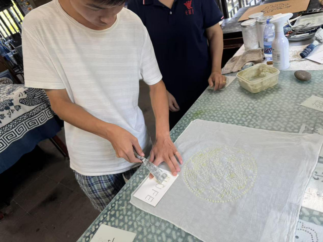 参观结束后,实践队员来到染房,体验蓝印花布的制作。在传承人的带领下,实践队员们仔细地感受了蓝印花布的“刻、刮、染、脱”四步古法,这一制作过程堪称一场精密的艺术创作:首先需将设计好的纹样雕刻在铜版纸上,再用刮刀将防染浆剂均匀刮入镂空部分,涂抹均匀之后将其风干,在风干过程中可亲自设计图案并将图案敲出,待风干后以同样的步骤将防染浆均匀刮入图案的镂空部分,再次进行晾晒,待晾晒完毕,把布料反复浸染蓝靛染料4-5次,最后通过清洗去除浆剂,呈现出层次分明的蓝白图案。通过传承人的讲解和队员的亲自动手,队员们感受到蓝印花布的制作如一场对称的修行——既守着“左右相顾、阴阳相生”的古法,也在创新中寻找传统与当下的对称点。