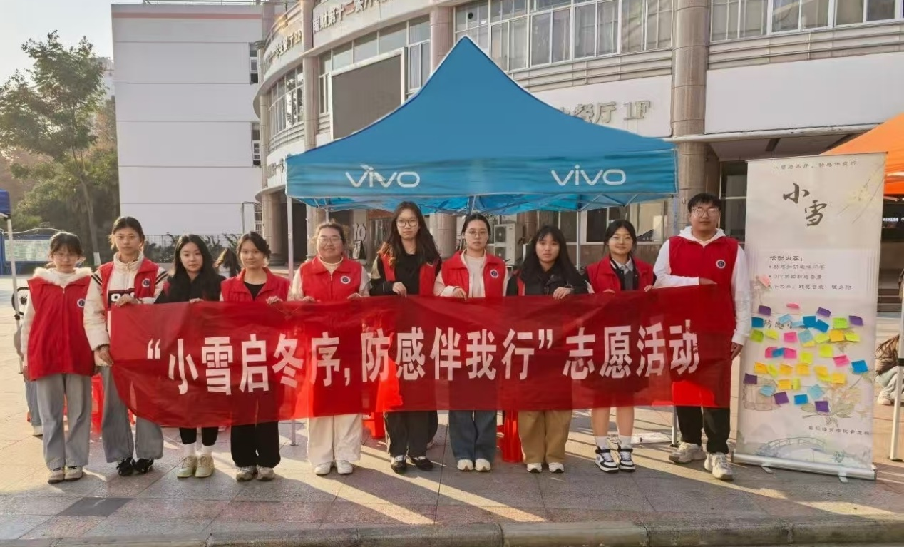 志愿者们在中苑食堂门口举办了“小雪启冬序,防感伴我行”小雪预防感冒志愿活动,志愿者们以热情服务与贴心互动,将小雪节气传统与冬季防感知识相融,为冬日校园添上浓厚的温暖底色。