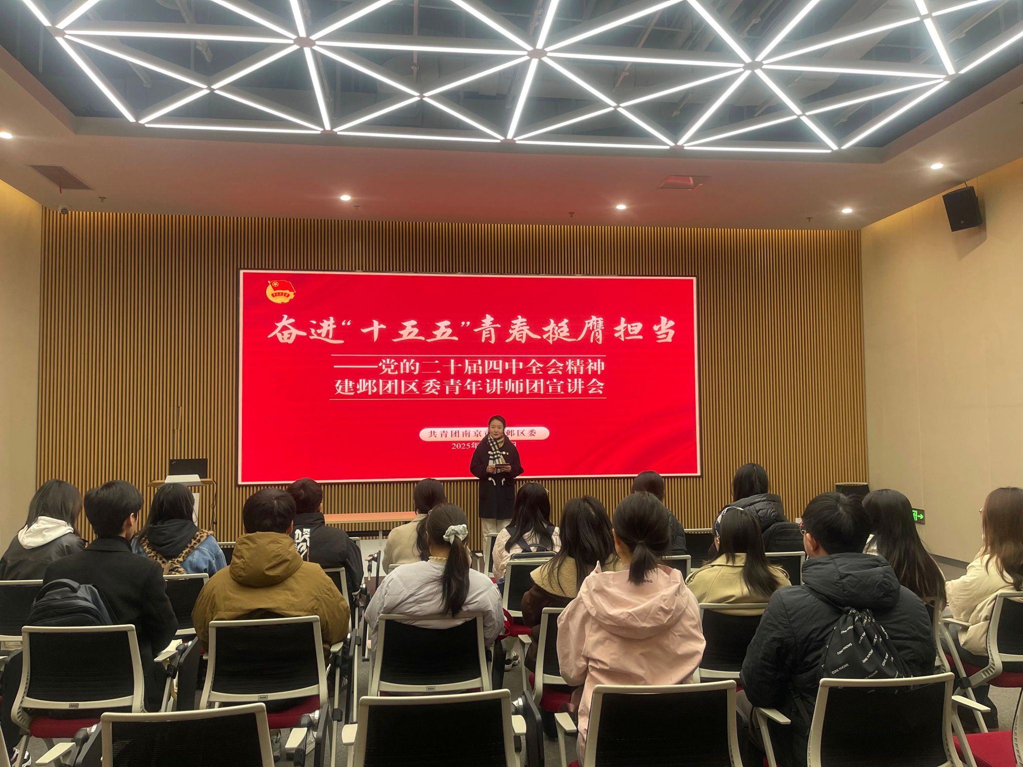 在参观结束后,同学们来到报告厅,参加“奋进‘十五五’ 青春挺膺担当——党的二十届四中全会精神宣讲会”,建邺区团委青年讲师围绕全会精神,结合青年成长与“十五五”规划,引导青年在新征程中主动担当、贡献青春力量。