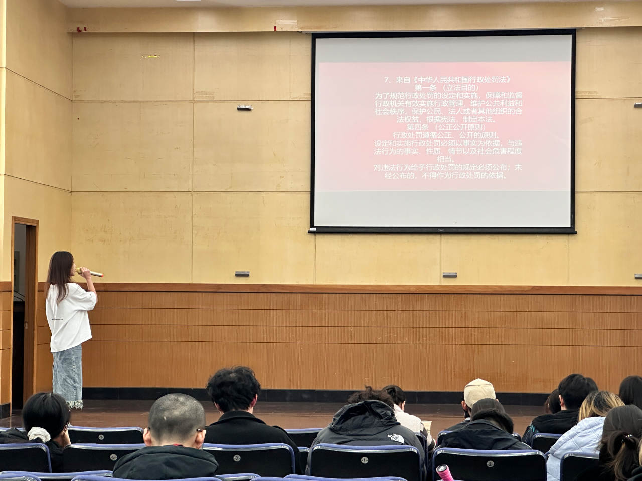 活动在庄重而热烈的气氛中拉开序幕。主持人首先阐述了本次比赛与国家宪法日的紧密关联,强调法治精神对青年成长的重要意义。比赛首环节为“法治宣言”。参赛选手依次登台,围绕个人对法治的理解与信仰进行一分钟陈述。选手们或慷慨激昂,或娓娓道来,用真挚的语言表达了对法律的敬畏与认同,展现了当代大学生应有的法治意识与责任担当。