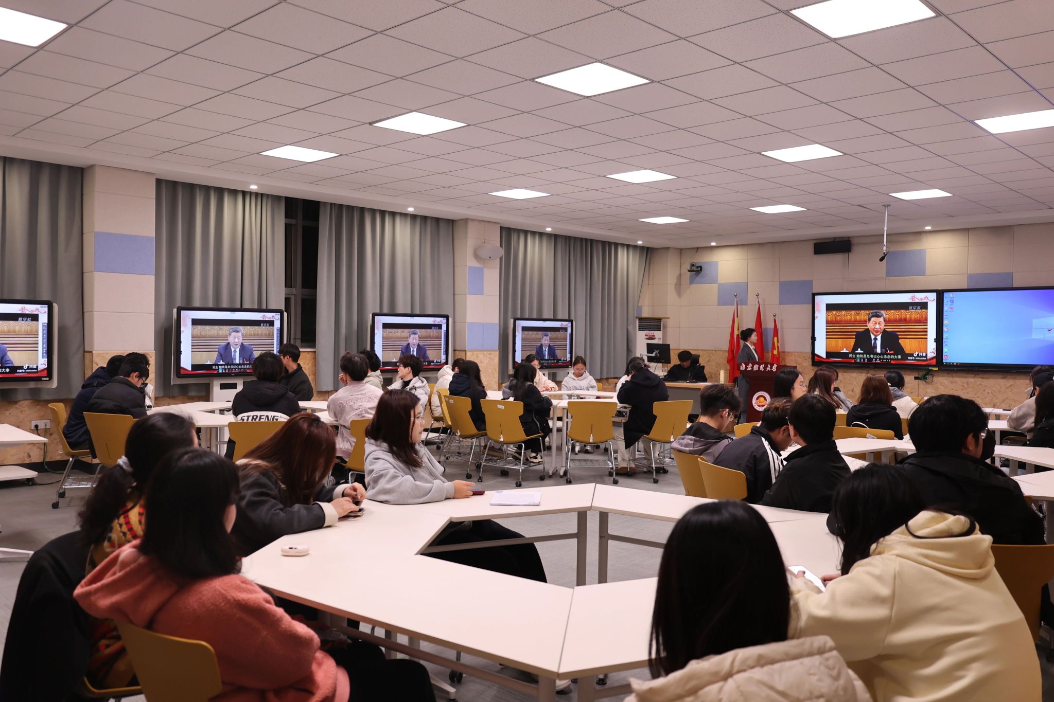 图为同学们集中学习两会资讯与经济运行简报 郭政摄