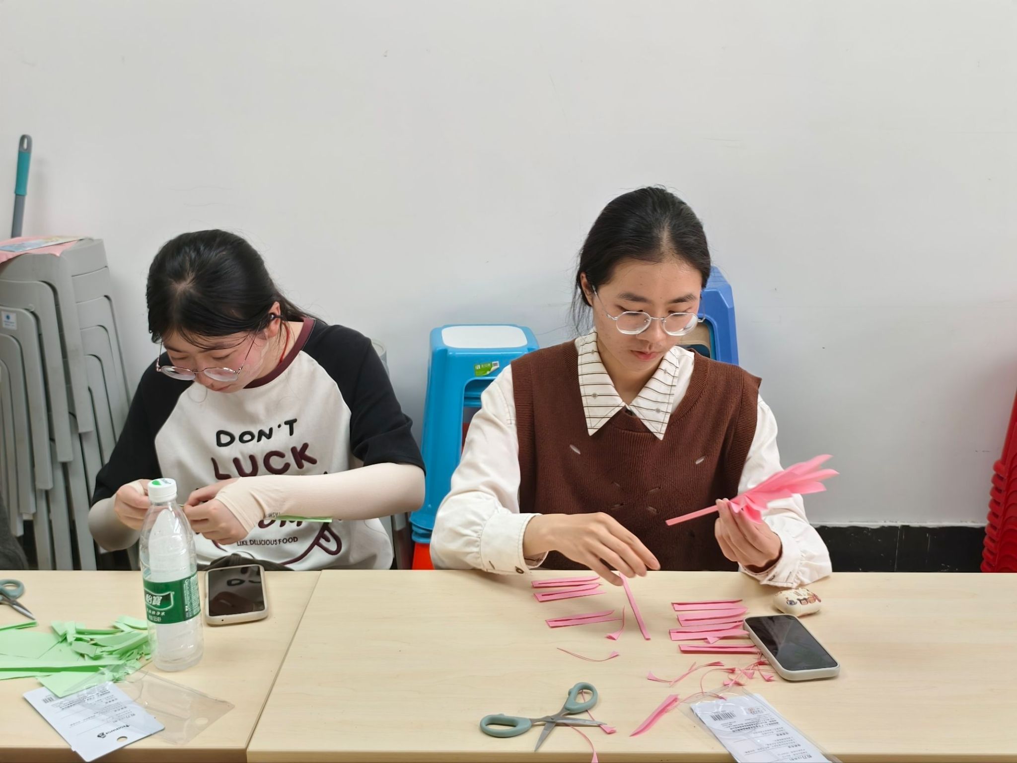 志愿者们回到德经楼401教室,开展“折柳寄思”手工体验。折柳,是清明最古老的习俗之一。古人送别时折柳相赠,取“留”的谐音,也借柳枝顽强的生命力寄托对远行人的祝福。志愿者们用绿色彩纸代替柳枝,一片片折叠、描画、拼接。有人写下春日的美好祈愿:“清明雨上,草木含情,愿绿水长流、青山常在。”有人借花喻人,写下对生命的珍视:“樱花七日,绚烂至极而归于沉寂,恰如生命之短暂与珍贵。”字里行间,既有青春的朝气,也有对传统的敬畏。