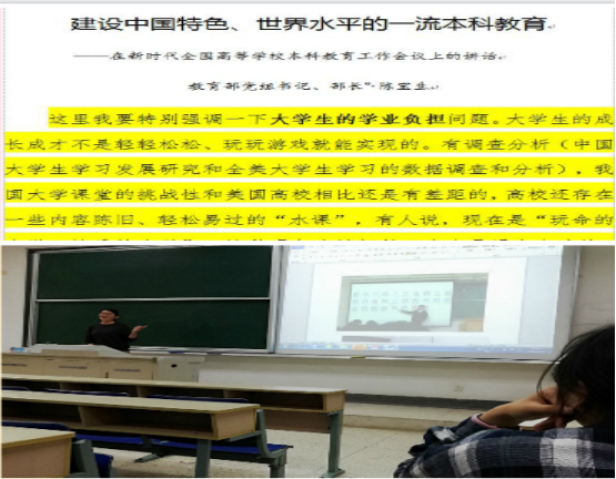 在班会初,张朋朋老师引用教育部部长陈宝生在新时代全国高等学校本科教育工作会议上的讲话,重点提到了大学生的成长成才不是轻轻松松、玩玩游戏就能实现的。对大学生既要有激励也要有约束,要改变考试评价方式,严格过程考评,让学生把更多的时间花在读书上,实现更加有效的学习。