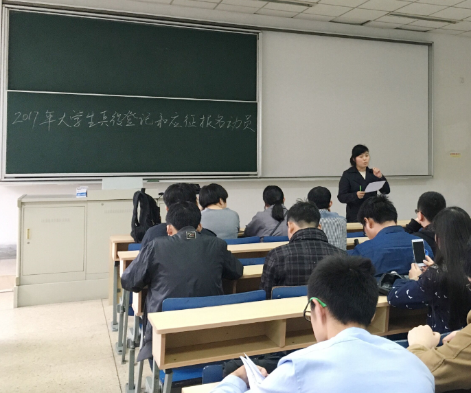 召开2017年在校大学生兵役登记和应征报名动员会,会议由2013级辅导员朱娟芳老师主持。