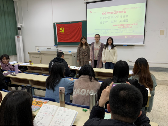 2021年12月11日,南京财经大学飞速直播 本科生第一党支部在在德经楼108教室召开预备党员转正支部大会,讨论本支部汪子欣、赵利、吴川丽3名预备党员按期转正事宜,支部大会由本科生第一党支部书记孙绪华主持,支部大会应到党员48人,实到党员48人,其中有表决权的正式党员8人,实到正式党员8人。