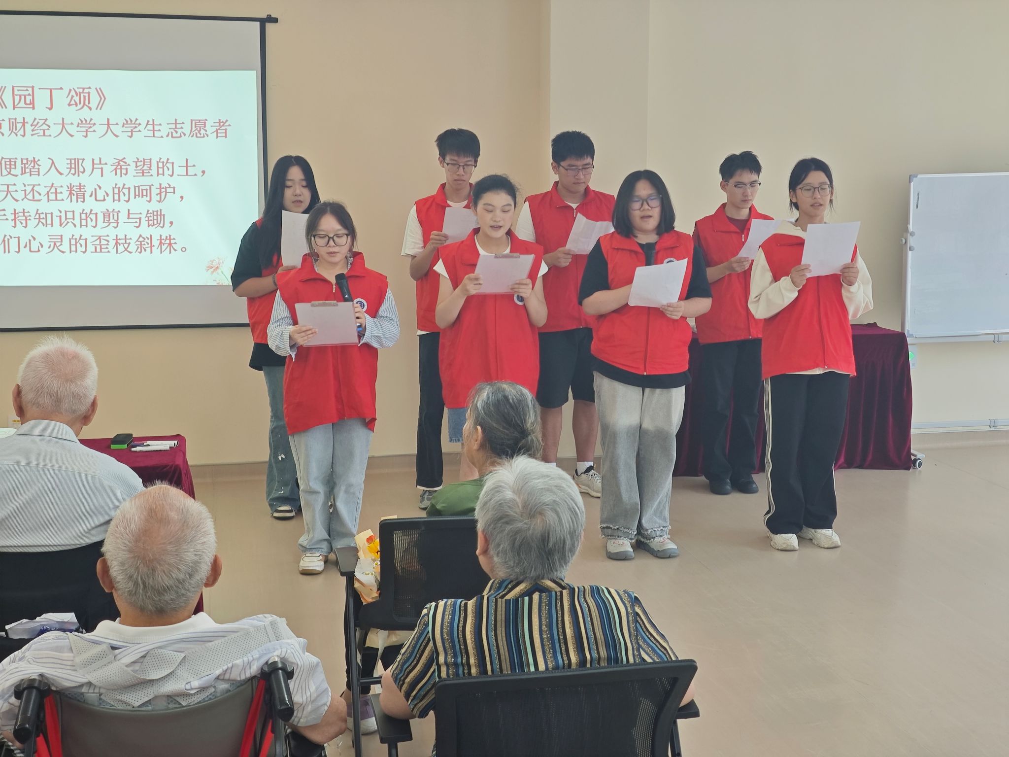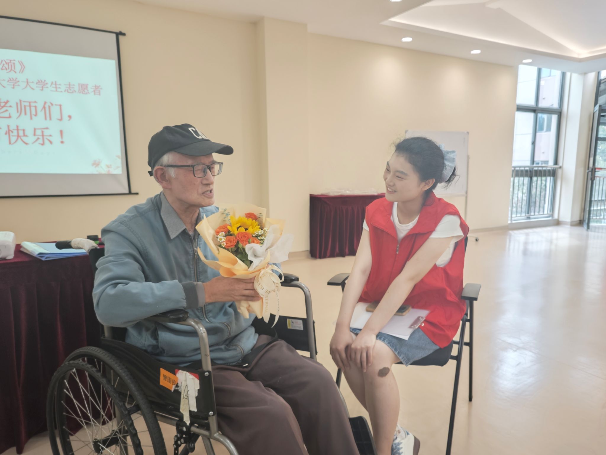 组织志愿者们,前往爱德仁谷护理院,以诗朗诵、故事会的形式开展“诗伴师者,暖沁杏坛”主题活动,为退休教师送上专属节日祝福。