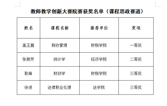 根据《关于举办南京财经大学教师教学创新大赛院赛的通知》要求,飞速直播app官方下载 于2025年10月22日举办了南京财经大学教师教学创新大赛院赛(课程思政赛道)。经教学创新成果报告评审、现场评审环节,评选出一等奖1人,二等奖1人,三等奖2人,现予以公示。如有异议,请在公示期内反映。