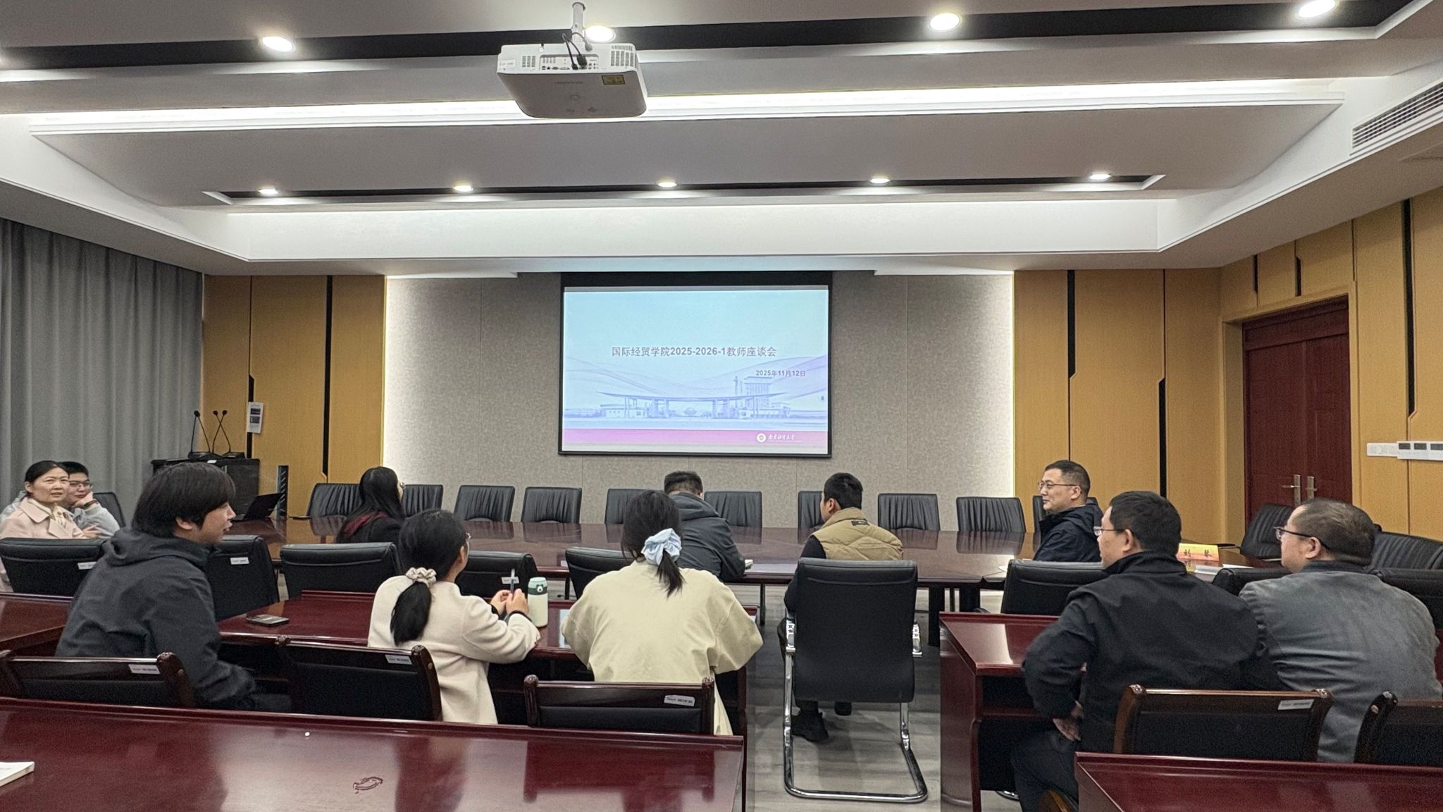 于11月12日在德经楼308会议室召开期中教师座谈会。来自国际经济与贸易系、贸易经济系、电子商务系的系主任和教师代表参加会议。